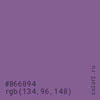Цвет #866094 в цветовой модели RGB обозначается тремя октетами (134, 96, 148) в десятичном формате и #866094 в шестнадцатиричном (hex) формате, которые являются интенсивностью красного 134 (hex 86), интенсивность зелёного 96 (hex 60) и интенсивность синего 148 (hex 94).