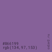 Цвет #866199 в цветовой модели RGB обозначается тремя октетами (134, 97, 153) в десятичном формате и #866199 в шестнадцатиричном (hex) формате, которые являются интенсивностью красного 134 (hex 86), интенсивность зелёного 97 (hex 61) и интенсивность синего 153 (hex 99).