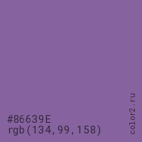 Цвет #86639E в цветовой модели RGB обозначается тремя октетами (134, 99, 158) в десятичном формате и #86639E в шестнадцатиричном (hex) формате, которые являются интенсивностью красного 134 (hex 86), интенсивность зелёного 99 (hex 63) и интенсивность синего 158 (hex 9E).