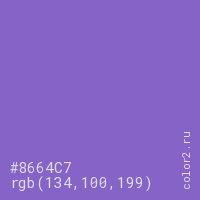 Цвет #8664C7 в цветовой модели RGB обозначается тремя октетами (134, 100, 199) в десятичном формате и #8664C7 в шестнадцатиричном (hex) формате, которые являются интенсивностью красного 134 (hex 86), интенсивность зелёного 100 (hex 64) и интенсивность синего 199 (hex C7).