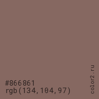 Цвет #866861 в цветовой модели RGB обозначается тремя октетами (134, 104, 97) в десятичном формате и #866861 в шестнадцатиричном (hex) формате, которые являются интенсивностью красного 134 (hex 86), интенсивность зелёного 104 (hex 68) и интенсивность синего 97 (hex 61).
