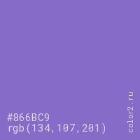 Цвет #866BC9 в цветовой модели RGB обозначается тремя октетами (134, 107, 201) в десятичном формате и #866BC9 в шестнадцатиричном (hex) формате, которые являются интенсивностью красного 134 (hex 86), интенсивность зелёного 107 (hex 6B) и интенсивность синего 201 (hex C9).