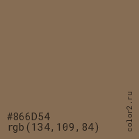 Цвет #866D54 в цветовой модели RGB обозначается тремя октетами (134, 109, 84) в десятичном формате и #866D54 в шестнадцатиричном (hex) формате, которые являются интенсивностью красного 134 (hex 86), интенсивность зелёного 109 (hex 6D) и интенсивность синего 84 (hex 54).