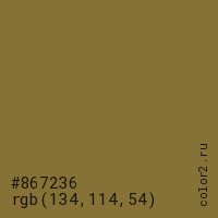 Цвет #867236 в цветовой модели RGB обозначается тремя октетами (134, 114, 54) в десятичном формате и #867236 в шестнадцатиричном (hex) формате, которые являются интенсивностью красного 134 (hex 86), интенсивность зелёного 114 (hex 72) и интенсивность синего 54 (hex 36).