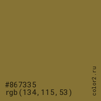 Цвет #867335 в цветовой модели RGB обозначается тремя октетами (134, 115, 53) в десятичном формате и #867335 в шестнадцатиричном (hex) формате, которые являются интенсивностью красного 134 (hex 86), интенсивность зелёного 115 (hex 73) и интенсивность синего 53 (hex 35).