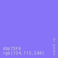 Цвет #8673F8 в цветовой модели RGB обозначается тремя октетами (134, 115, 248) в десятичном формате и #8673F8 в шестнадцатиричном (hex) формате, которые являются интенсивностью красного 134 (hex 86), интенсивность зелёного 115 (hex 73) и интенсивность синего 248 (hex F8).