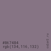 Цвет #867484 в цветовой модели RGB обозначается тремя октетами (134, 116, 132) в десятичном формате и #867484 в шестнадцатиричном (hex) формате, которые являются интенсивностью красного 134 (hex 86), интенсивность зелёного 116 (hex 74) и интенсивность синего 132 (hex 84).