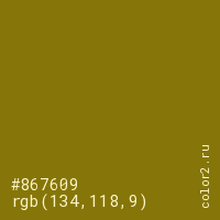 Цвет #867609 в цветовой модели RGB обозначается тремя октетами (134, 118, 9) в десятичном формате и #867609 в шестнадцатиричном (hex) формате, которые являются интенсивностью красного 134 (hex 86), интенсивность зелёного 118 (hex 76) и интенсивность синего 9 (hex 09).