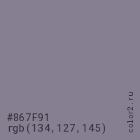 Цвет #867F91 в цветовой модели RGB обозначается тремя октетами (134, 127, 145) в десятичном формате и #867F91 в шестнадцатиричном (hex) формате, которые являются интенсивностью красного 134 (hex 86), интенсивность зелёного 127 (hex 7F) и интенсивность синего 145 (hex 91).