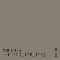 Цвет #868073 в цветовой модели RGB обозначается тремя октетами (134, 128, 115) в десятичном формате и #868073 в шестнадцатиричном (hex) формате, которые являются интенсивностью красного 134 (hex 86), интенсивность зелёного 128 (hex 80) и интенсивность синего 115 (hex 73).