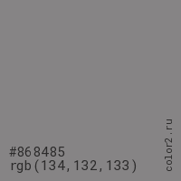 Цвет #868485 в цветовой модели RGB обозначается тремя октетами (134, 132, 133) в десятичном формате и #868485 в шестнадцатиричном (hex) формате, которые являются интенсивностью красного 134 (hex 86), интенсивность зелёного 132 (hex 84) и интенсивность синего 133 (hex 85).