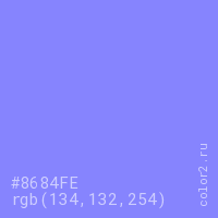 Цвет #8684FE в цветовой модели RGB обозначается тремя октетами (134, 132, 254) в десятичном формате и #8684FE в шестнадцатиричном (hex) формате, которые являются интенсивностью красного 134 (hex 86), интенсивность зелёного 132 (hex 84) и интенсивность синего 254 (hex FE).
