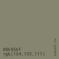 Цвет #86856F в цветовой модели RGB обозначается тремя октетами (134, 133, 111) в десятичном формате и #86856F в шестнадцатиричном (hex) формате, которые являются интенсивностью красного 134 (hex 86), интенсивность зелёного 133 (hex 85) и интенсивность синего 111 (hex 6F).