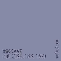 Цвет #868AA7 в цветовой модели RGB обозначается тремя октетами (134, 138, 167) в десятичном формате и #868AA7 в шестнадцатиричном (hex) формате, которые являются интенсивностью красного 134 (hex 86), интенсивность зелёного 138 (hex 8A) и интенсивность синего 167 (hex A7).