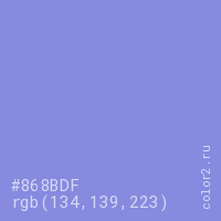 Цвет #868BDF в цветовой модели RGB обозначается тремя октетами (134, 139, 223) в десятичном формате и #868BDF в шестнадцатиричном (hex) формате, которые являются интенсивностью красного 134 (hex 86), интенсивность зелёного 139 (hex 8B) и интенсивность синего 223 (hex DF).