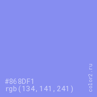 Цвет #868DF1 в цветовой модели RGB обозначается тремя октетами (134, 141, 241) в десятичном формате и #868DF1 в шестнадцатиричном (hex) формате, которые являются интенсивностью красного 134 (hex 86), интенсивность зелёного 141 (hex 8D) и интенсивность синего 241 (hex F1).