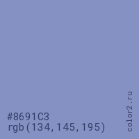 Цвет #8691C3 в цветовой модели RGB обозначается тремя октетами (134, 145, 195) в десятичном формате и #8691C3 в шестнадцатиричном (hex) формате, которые являются интенсивностью красного 134 (hex 86), интенсивность зелёного 145 (hex 91) и интенсивность синего 195 (hex C3).