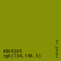 Цвет #869205 в цветовой модели RGB обозначается тремя октетами (134, 146, 5) в десятичном формате и #869205 в шестнадцатиричном (hex) формате, которые являются интенсивностью красного 134 (hex 86), интенсивность зелёного 146 (hex 92) и интенсивность синего 5 (hex 05).