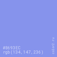 Цвет #8693EC в цветовой модели RGB обозначается тремя октетами (134, 147, 236) в десятичном формате и #8693EC в шестнадцатиричном (hex) формате, которые являются интенсивностью красного 134 (hex 86), интенсивность зелёного 147 (hex 93) и интенсивность синего 236 (hex EC).