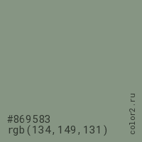 Цвет #869583 в цветовой модели RGB обозначается тремя октетами (134, 149, 131) в десятичном формате и #869583 в шестнадцатиричном (hex) формате, которые являются интенсивностью красного 134 (hex 86), интенсивность зелёного 149 (hex 95) и интенсивность синего 131 (hex 83).
