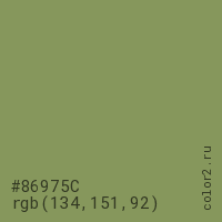 Цвет #86975C в цветовой модели RGB обозначается тремя октетами (134, 151, 92) в десятичном формате и #86975C в шестнадцатиричном (hex) формате, которые являются интенсивностью красного 134 (hex 86), интенсивность зелёного 151 (hex 97) и интенсивность синего 92 (hex 5C).