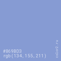 Цвет #869BD3 в цветовой модели RGB обозначается тремя октетами (134, 155, 211) в десятичном формате и #869BD3 в шестнадцатиричном (hex) формате, которые являются интенсивностью красного 134 (hex 86), интенсивность зелёного 155 (hex 9B) и интенсивность синего 211 (hex D3).