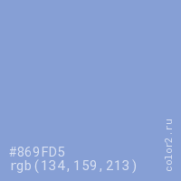 Цвет #869FD5 в цветовой модели RGB обозначается тремя октетами (134, 159, 213) в десятичном формате и #869FD5 в шестнадцатиричном (hex) формате, которые являются интенсивностью красного 134 (hex 86), интенсивность зелёного 159 (hex 9F) и интенсивность синего 213 (hex D5).