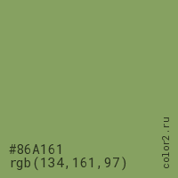 Цвет #86A161 в цветовой модели RGB обозначается тремя октетами (134, 161, 97) в десятичном формате и #86A161 в шестнадцатиричном (hex) формате, которые являются интенсивностью красного 134 (hex 86), интенсивность зелёного 161 (hex A1) и интенсивность синего 97 (hex 61).