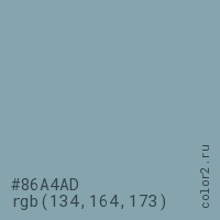 Цвет #86A4AD в цветовой модели RGB обозначается тремя октетами (134, 164, 173) в десятичном формате и #86A4AD в шестнадцатиричном (hex) формате, которые являются интенсивностью красного 134 (hex 86), интенсивность зелёного 164 (hex A4) и интенсивность синего 173 (hex AD).