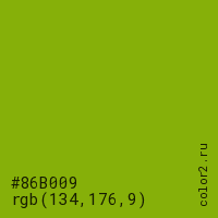 Цвет #86B009 в цветовой модели RGB обозначается тремя октетами (134, 176, 9) в десятичном формате и #86B009 в шестнадцатиричном (hex) формате, которые являются интенсивностью красного 134 (hex 86), интенсивность зелёного 176 (hex B0) и интенсивность синего 9 (hex 09).