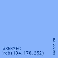 Цвет #86B2FC в цветовой модели RGB обозначается тремя октетами (134, 178, 252) в десятичном формате и #86B2FC в шестнадцатиричном (hex) формате, которые являются интенсивностью красного 134 (hex 86), интенсивность зелёного 178 (hex B2) и интенсивность синего 252 (hex FC).