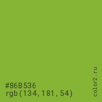 Цвет #86B536 в цветовой модели RGB обозначается тремя октетами (134, 181, 54) в десятичном формате и #86B536 в шестнадцатиричном (hex) формате, которые являются интенсивностью красного 134 (hex 86), интенсивность зелёного 181 (hex B5) и интенсивность синего 54 (hex 36).