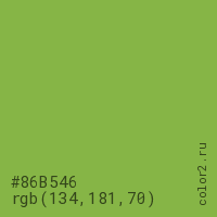 Цвет #86B546 в цветовой модели RGB обозначается тремя октетами (134, 181, 70) в десятичном формате и #86B546 в шестнадцатиричном (hex) формате, которые являются интенсивностью красного 134 (hex 86), интенсивность зелёного 181 (hex B5) и интенсивность синего 70 (hex 46).