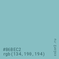 Цвет #86BEC2 в цветовой модели RGB обозначается тремя октетами (134, 190, 194) в десятичном формате и #86BEC2 в шестнадцатиричном (hex) формате, которые являются интенсивностью красного 134 (hex 86), интенсивность зелёного 190 (hex BE) и интенсивность синего 194 (hex C2).