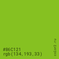 Цвет #86C121 в цветовой модели RGB обозначается тремя октетами (134, 193, 33) в десятичном формате и #86C121 в шестнадцатиричном (hex) формате, которые являются интенсивностью красного 134 (hex 86), интенсивность зелёного 193 (hex C1) и интенсивность синего 33 (hex 21).