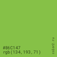 Цвет #86C147 в цветовой модели RGB обозначается тремя октетами (134, 193, 71) в десятичном формате и #86C147 в шестнадцатиричном (hex) формате, которые являются интенсивностью красного 134 (hex 86), интенсивность зелёного 193 (hex C1) и интенсивность синего 71 (hex 47).