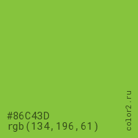 Цвет #86C43D в цветовой модели RGB обозначается тремя октетами (134, 196, 61) в десятичном формате и #86C43D в шестнадцатиричном (hex) формате, которые являются интенсивностью красного 134 (hex 86), интенсивность зелёного 196 (hex C4) и интенсивность синего 61 (hex 3D).