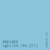 Цвет #86C4D9 в цветовой модели RGB обозначается тремя октетами (134, 196, 217) в десятичном формате и #86C4D9 в шестнадцатиричном (hex) формате, которые являются интенсивностью красного 134 (hex 86), интенсивность зелёного 196 (hex C4) и интенсивность синего 217 (hex D9).