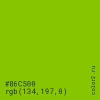 Цвет #86C500 в цветовой модели RGB обозначается тремя октетами (134, 197, 0) в десятичном формате и #86C500 в шестнадцатиричном (hex) формате, которые являются интенсивностью красного 134 (hex 86), интенсивность зелёного 197 (hex C5) и интенсивность синего 0 (hex 00).