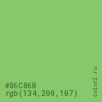 Цвет #86C86B в цветовой модели RGB обозначается тремя октетами (134, 200, 107) в десятичном формате и #86C86B в шестнадцатиричном (hex) формате, которые являются интенсивностью красного 134 (hex 86), интенсивность зелёного 200 (hex C8) и интенсивность синего 107 (hex 6B).
