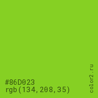 Цвет #86D023 в цветовой модели RGB обозначается тремя октетами (134, 208, 35) в десятичном формате и #86D023 в шестнадцатиричном (hex) формате, которые являются интенсивностью красного 134 (hex 86), интенсивность зелёного 208 (hex D0) и интенсивность синего 35 (hex 23).