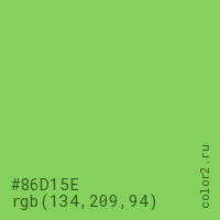 Цвет #86D15E в цветовой модели RGB обозначается тремя октетами (134, 209, 94) в десятичном формате и #86D15E в шестнадцатиричном (hex) формате, которые являются интенсивностью красного 134 (hex 86), интенсивность зелёного 209 (hex D1) и интенсивность синего 94 (hex 5E).
