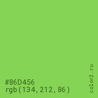 Цвет #86D456 в цветовой модели RGB обозначается тремя октетами (134, 212, 86) в десятичном формате и #86D456 в шестнадцатиричном (hex) формате, которые являются интенсивностью красного 134 (hex 86), интенсивность зелёного 212 (hex D4) и интенсивность синего 86 (hex 56).