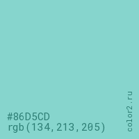 Цвет #86D5CD в цветовой модели RGB обозначается тремя октетами (134, 213, 205) в десятичном формате и #86D5CD в шестнадцатиричном (hex) формате, которые являются интенсивностью красного 134 (hex 86), интенсивность зелёного 213 (hex D5) и интенсивность синего 205 (hex CD).