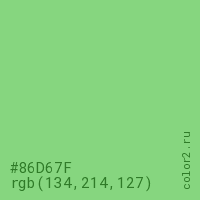 Цвет #86D67F в цветовой модели RGB обозначается тремя октетами (134, 214, 127) в десятичном формате и #86D67F в шестнадцатиричном (hex) формате, которые являются интенсивностью красного 134 (hex 86), интенсивность зелёного 214 (hex D6) и интенсивность синего 127 (hex 7F).