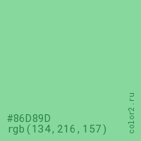 Цвет #86D89D в цветовой модели RGB обозначается тремя октетами (134, 216, 157) в десятичном формате и #86D89D в шестнадцатиричном (hex) формате, которые являются интенсивностью красного 134 (hex 86), интенсивность зелёного 216 (hex D8) и интенсивность синего 157 (hex 9D).