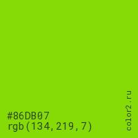 Цвет #86DB07 в цветовой модели RGB обозначается тремя октетами (134, 219, 7) в десятичном формате и #86DB07 в шестнадцатиричном (hex) формате, которые являются интенсивностью красного 134 (hex 86), интенсивность зелёного 219 (hex DB) и интенсивность синего 7 (hex 07).