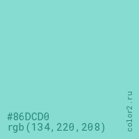 Цвет #86DCD0 в цветовой модели RGB обозначается тремя октетами (134, 220, 208) в десятичном формате и #86DCD0 в шестнадцатиричном (hex) формате, которые являются интенсивностью красного 134 (hex 86), интенсивность зелёного 220 (hex DC) и интенсивность синего 208 (hex D0).