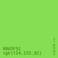 Цвет #86DF52 в цветовой модели RGB обозначается тремя октетами (134, 223, 82) в десятичном формате и #86DF52 в шестнадцатиричном (hex) формате, которые являются интенсивностью красного 134 (hex 86), интенсивность зелёного 223 (hex DF) и интенсивность синего 82 (hex 52).