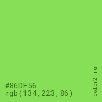 Цвет #86DF56 в цветовой модели RGB обозначается тремя октетами (134, 223, 86) в десятичном формате и #86DF56 в шестнадцатиричном (hex) формате, которые являются интенсивностью красного 134 (hex 86), интенсивность зелёного 223 (hex DF) и интенсивность синего 86 (hex 56).